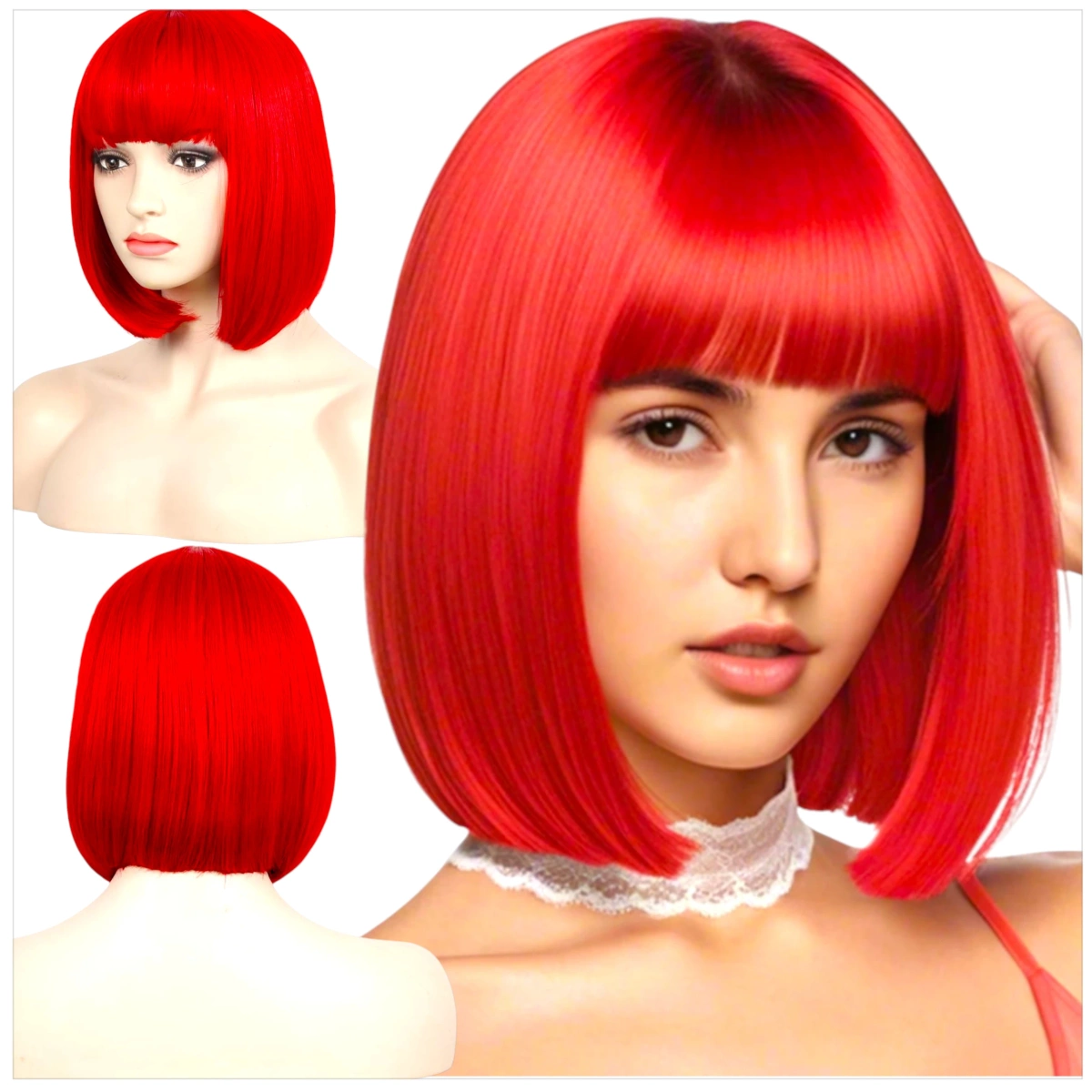 - Czerwona peruka bob z grzywką retro lata 60 wyróżnia się intensywnym, neonowym kolorem, który dodaje stylizacji charakteru i odwagi.