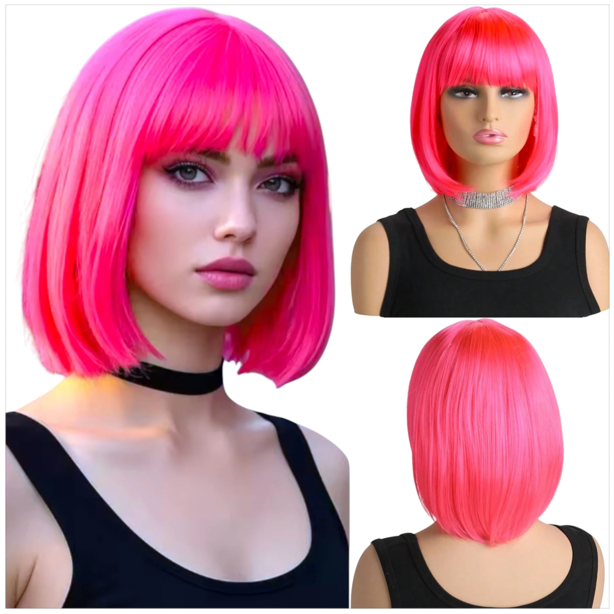 - Różowa peruka bob z grzywką retro lata 60 wyróżnia się intensywnym, neonowym kolorem, który dodaje stylizacji charakteru i odwagi.
