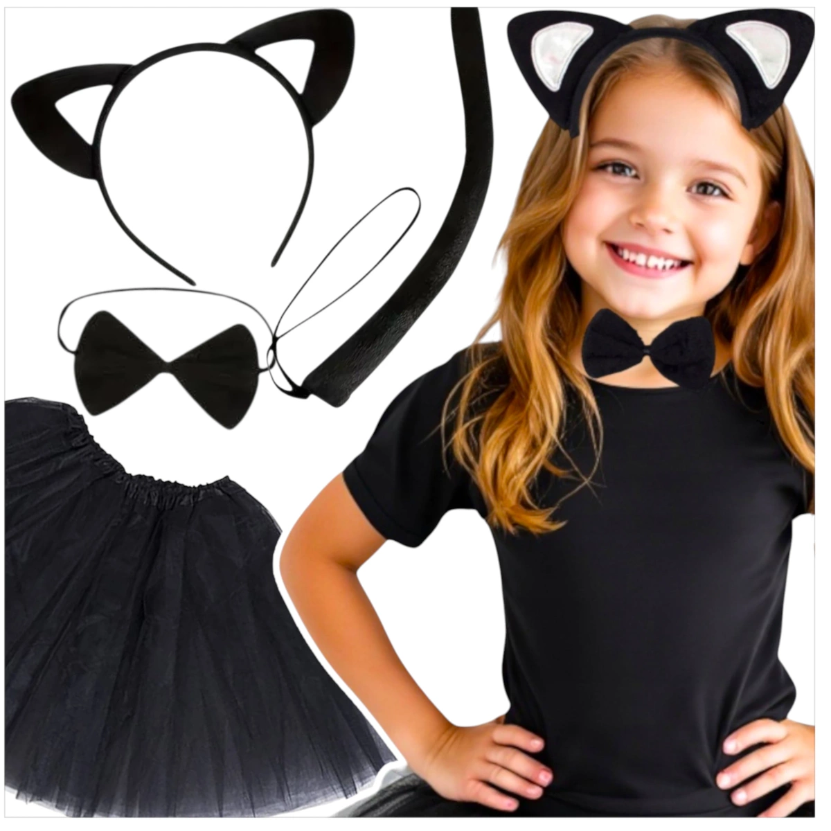 STRÓJ DLA DZIEWCZYNKI - CZARNY KOTEK KOT 3w1 OPASKA SPÓDNICZKA