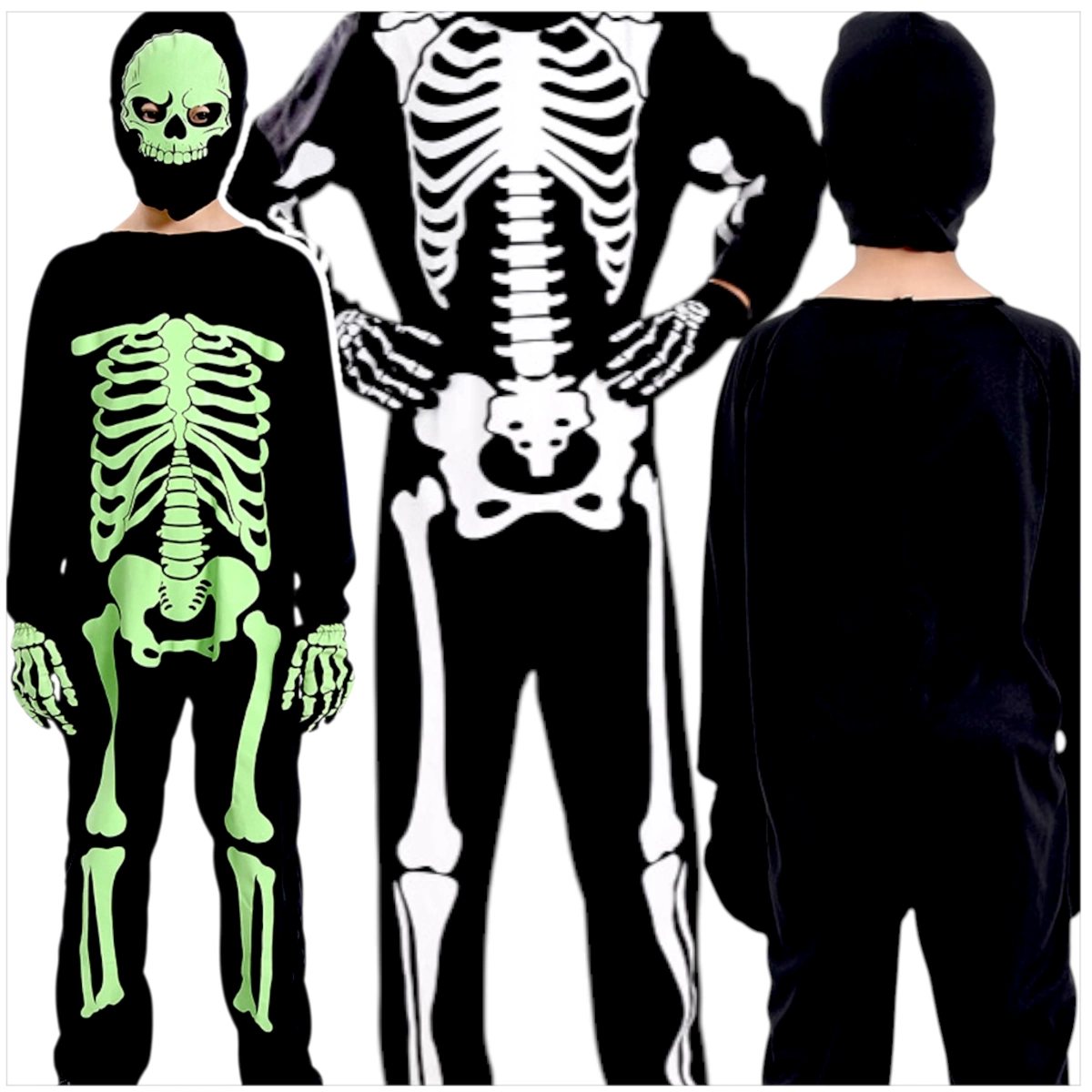 Największa atrakcja tego stroju? Fluorescencyjny nadruk kości, który świeci w ciemności! Wystarczy chwila w jasnym świetle, by potem robić niesamowite wrażenie po zmroku. Nadruk rozmieszczony jest na całym kombinezonie, czapce i rękawiczkach – efekt jest naprawdę pełny i robi wrażenie nie tylko na dzieciach, ale i dorosłych!