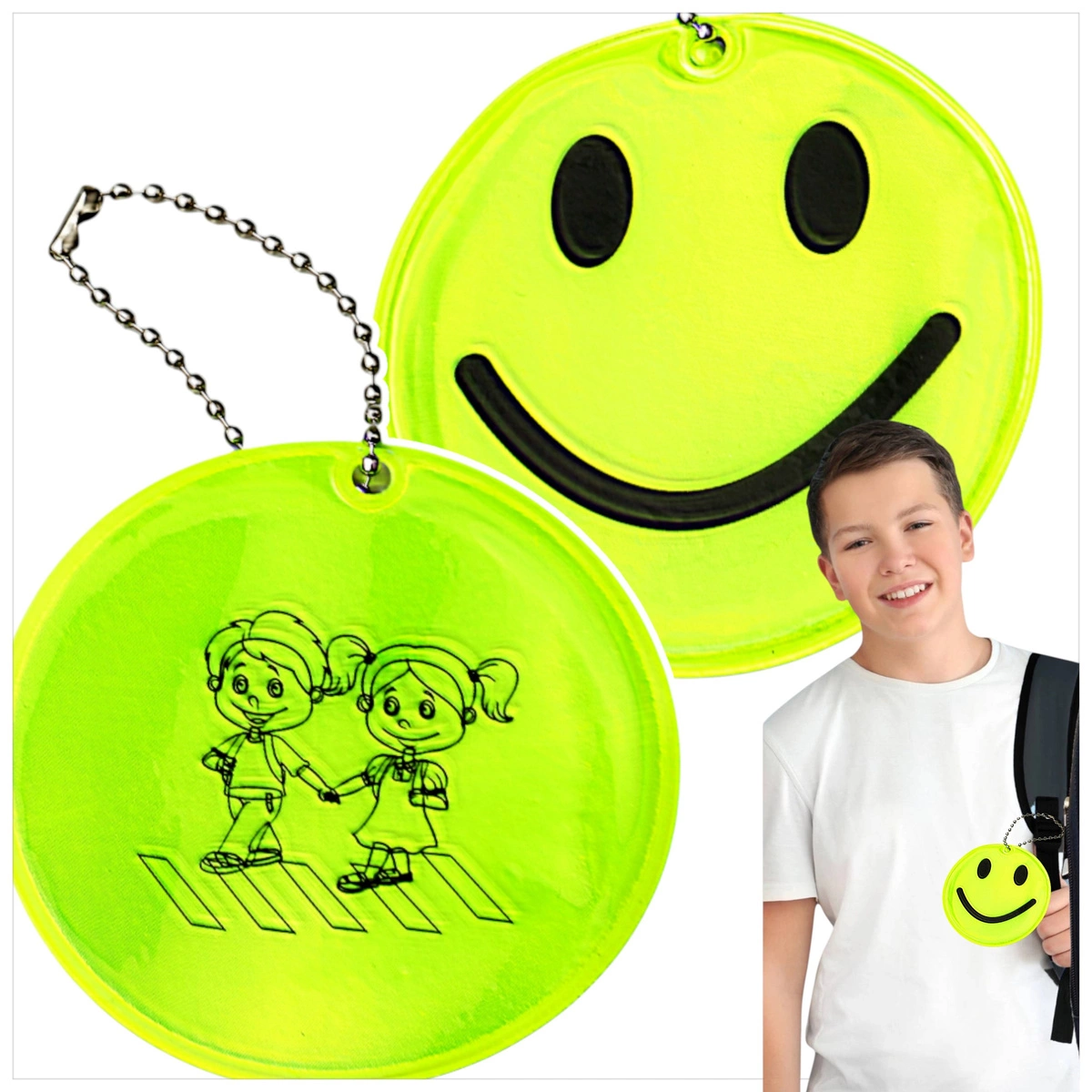 BRELOCZEK ODBLASKOWY ZAWIESZKA DO PLECAKA BUŹKA DO TORNISTRA BRELOK UŚMIECH