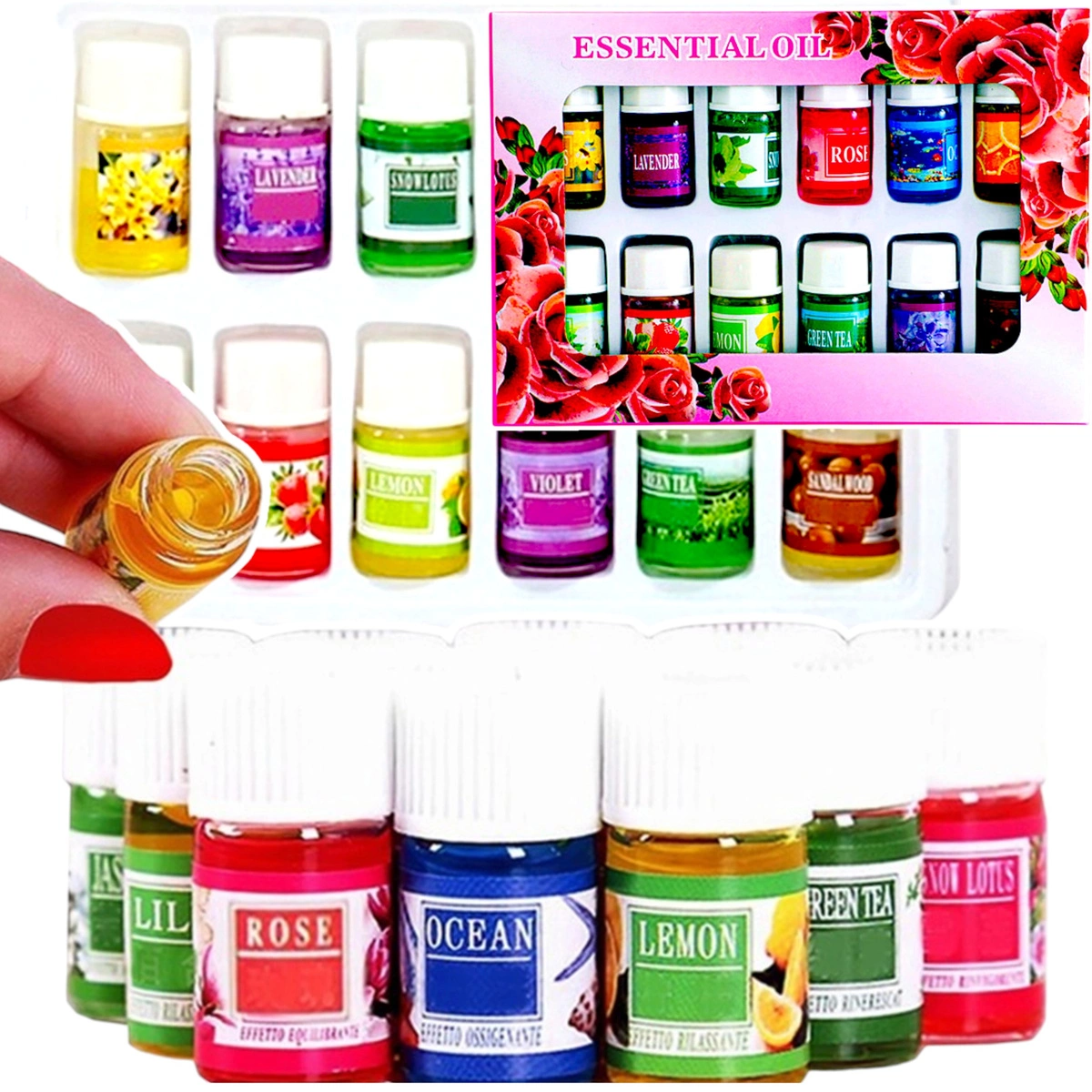 - Zestaw zawiera 12 naturalnych olejków eterycznych, które pozwalają dobrać zapach do nastroju, pory dnia lub celu aromaterapii – od relaksu po pobudzenie.