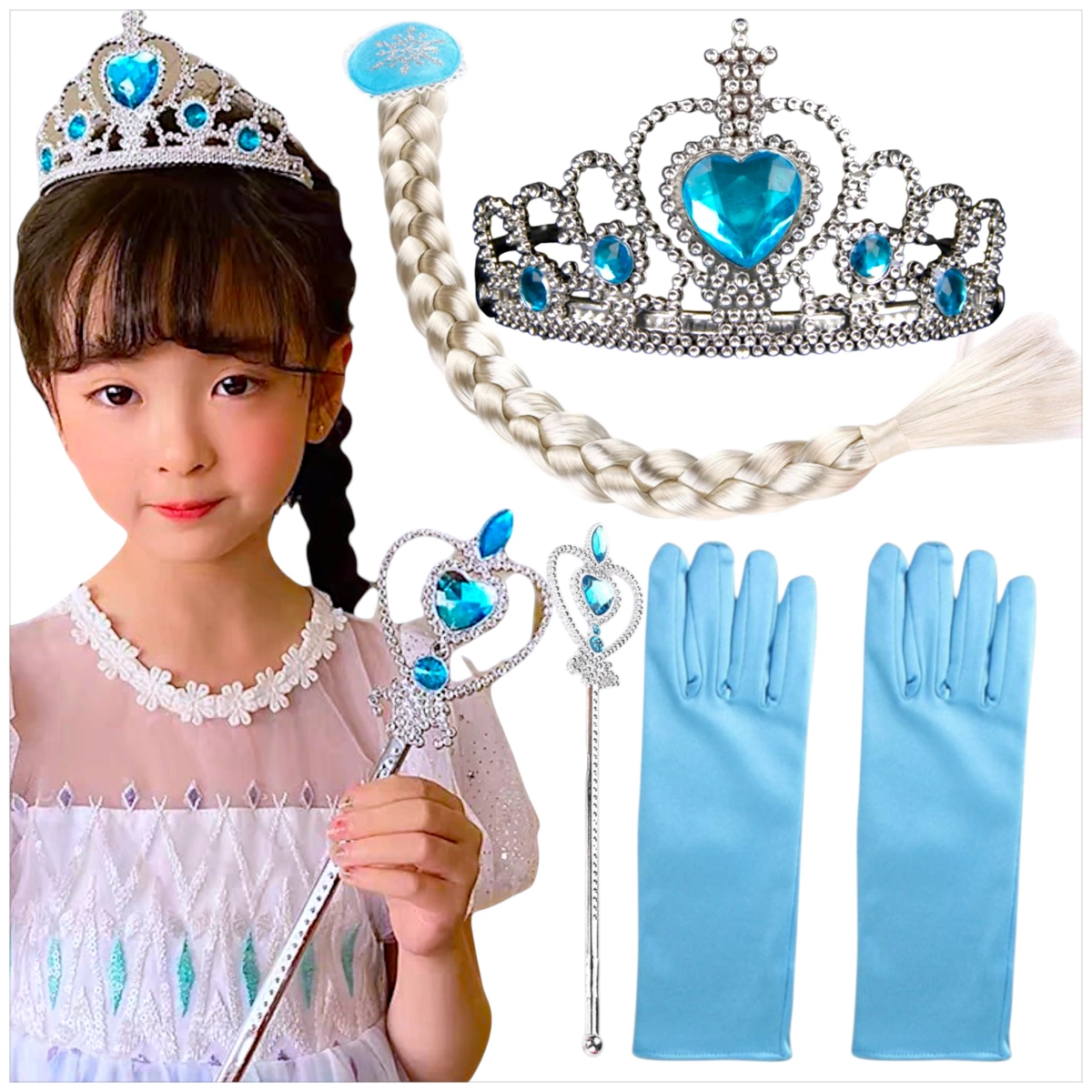 Dodatki są lekkie, wygodne i dostosowane do dziecięcych potrzeb. Różdżka i diadem lśnią w świetle, warkocz pięknie prezentuje się przypięty do włosów, a rękawiczki dodają całości królewskiego uroku.