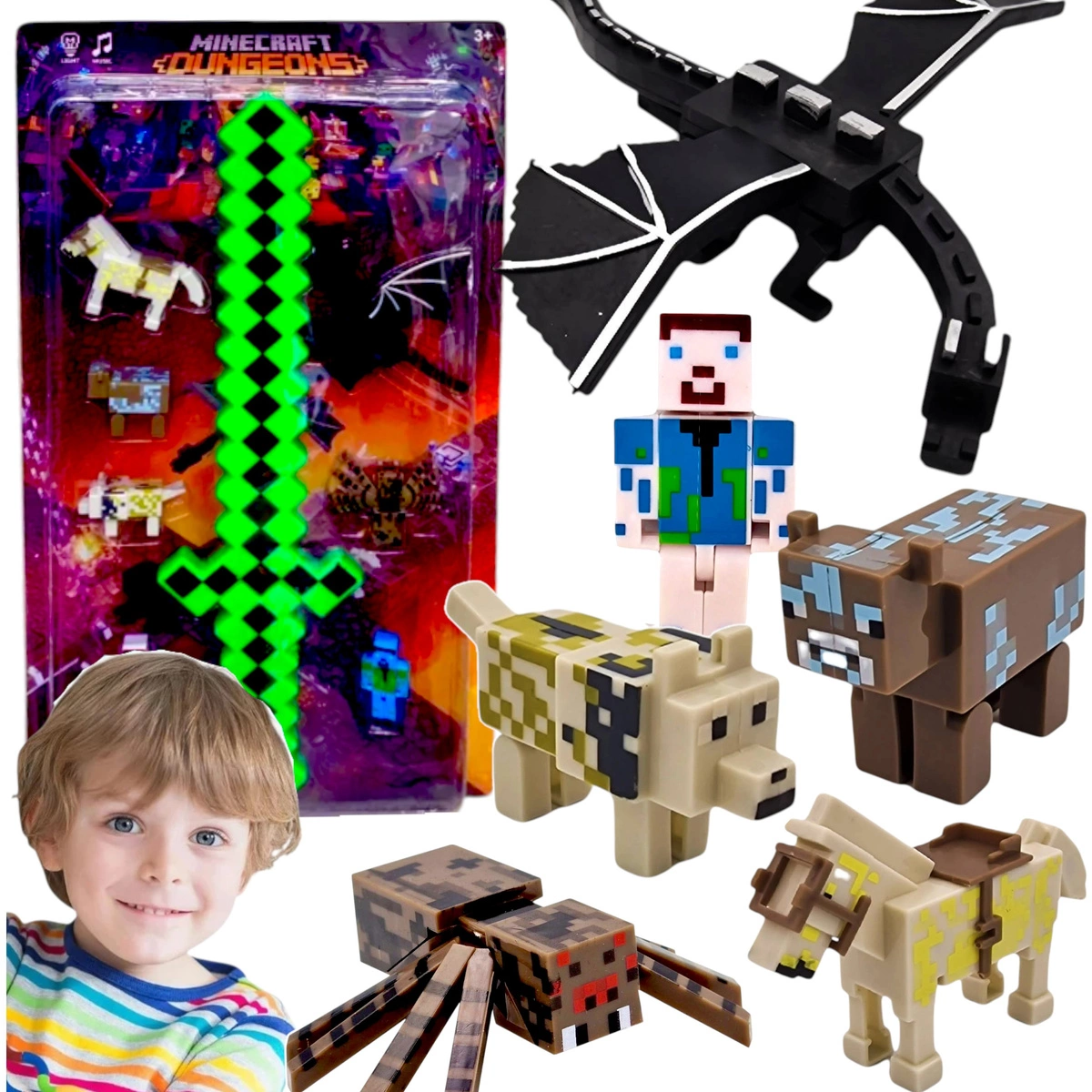MINECRAFT - ZWSTAW 7 FIGUREK Z GRY DUŻY ZESTAW 8W1 MIECZ PIXEL ŚWIECĄCY